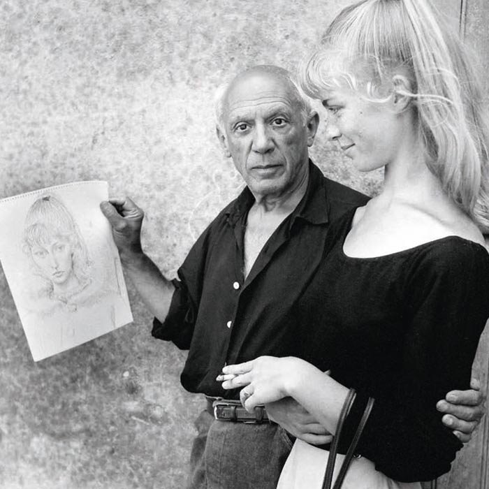 Fait amusant : toujours en 1956, Bardot, toute nouvellement blonde mais encore relativement inconnue, a de nouveau mis ses pieds dans les traces de Sylvette David. Était-ce volontaire ou fortuit ? Nourrissait-elle une fascination sincère et inspirée pour cette jeune fille du même âge à laquelle elle devait déjà tant, et à laquelle elle allait devoir en partie son incroyable destin ? Ou une obsession malsaine, peut-être empreinte de rivalité, voire de jalousie pimbêche et imitatrice ? Toujours est-il qu’elle est allée rendre visite à… Pablo Picasso, qui avait notoirement immortalisé Sylvette David quelques années plus tôt.