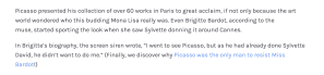 C’est pour cette raison qu’il y a pléthore de photos de cette entrevue Bardot-Picasso, mais aucun tableau de Bardot par Picasso. Même si, Brigitte Bardot étant devenue une icône par la suite, et Sylvette David ayant choisi le chemin de la discrétion, il est fréquent que les gens pensent que la première est la fille à la queue de cheval des tableaux de Picasso, les photos d’archives réunissant Bardot et Picasso ayant cimenté cette confusion dans l’imaginaire collectif.